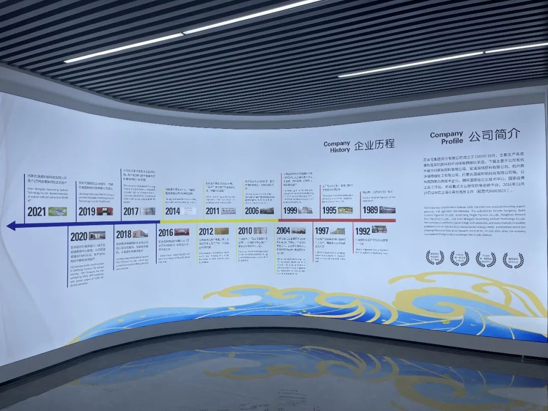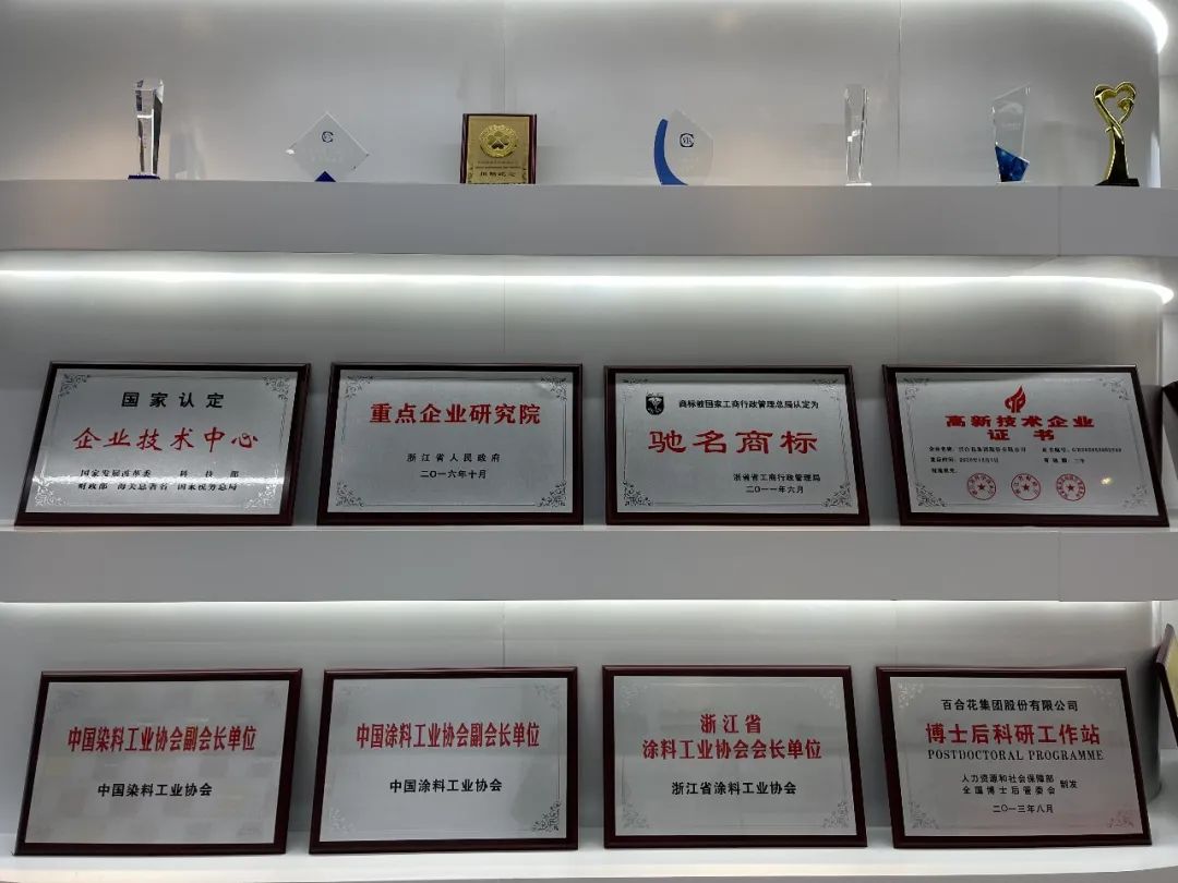 公司的荣誉墙展示了历年来公司获得的部分荣誉:国家级企业技术中心,浙江省重点企业研究院,CNAS实验室认证等。同时,完美体育在线登录花也是中国涂料工业协会、中国染料工业协会副会长单位,浙江省涂料工业协会会长、钱塘区环保协会和钱塘区商会会长单位。这代表完美体育在线登录花不仅得到了各级部门、同行的认可,也有了更大的平台来贡献自己的力量,在有机颜料领域有更多的机会引领行业的健康发展。