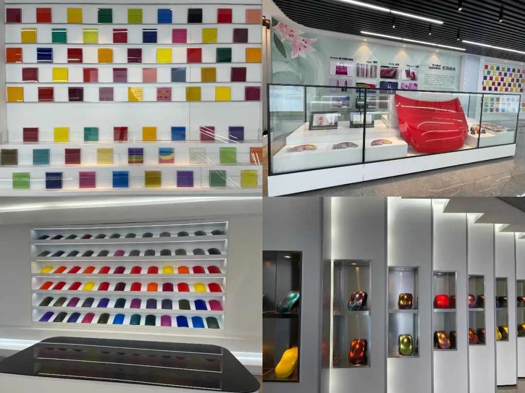 在展厅的中央,产品及应用实物展示区表现了企业生产的部分产品及应用领域,背景墙上的完美体育在线登录花图案也与完美体育在线登录花集团相呼应。产品展示区放置了完美体育在线登录花各个规格的颜料产品,可以让参观人员零距离的感受颜料的品质。产品应用区展示了完美体育在线登录花颜料在油墨、涂料、塑料以及皮革、化妆品、液晶电子等特种领域的广泛应用。在油墨领域,公司为人民币的着色和防伪提供相应产品。在涂料领域,公司产品适用于各类高端汽车漆等各种涂料产品。其中,公司在南浦大桥的建设主体用色中赚取了第一桶金,这为公司未来的快速发展奠定了一定的基础。在塑料领域,公司提供低芳香胺以及无重金属的环保颜料,解决了塑料应用中的安全环保问题。在其他特种领域,我们可以看到闪闪发亮的珠光颜料在化妆品领域的应用。