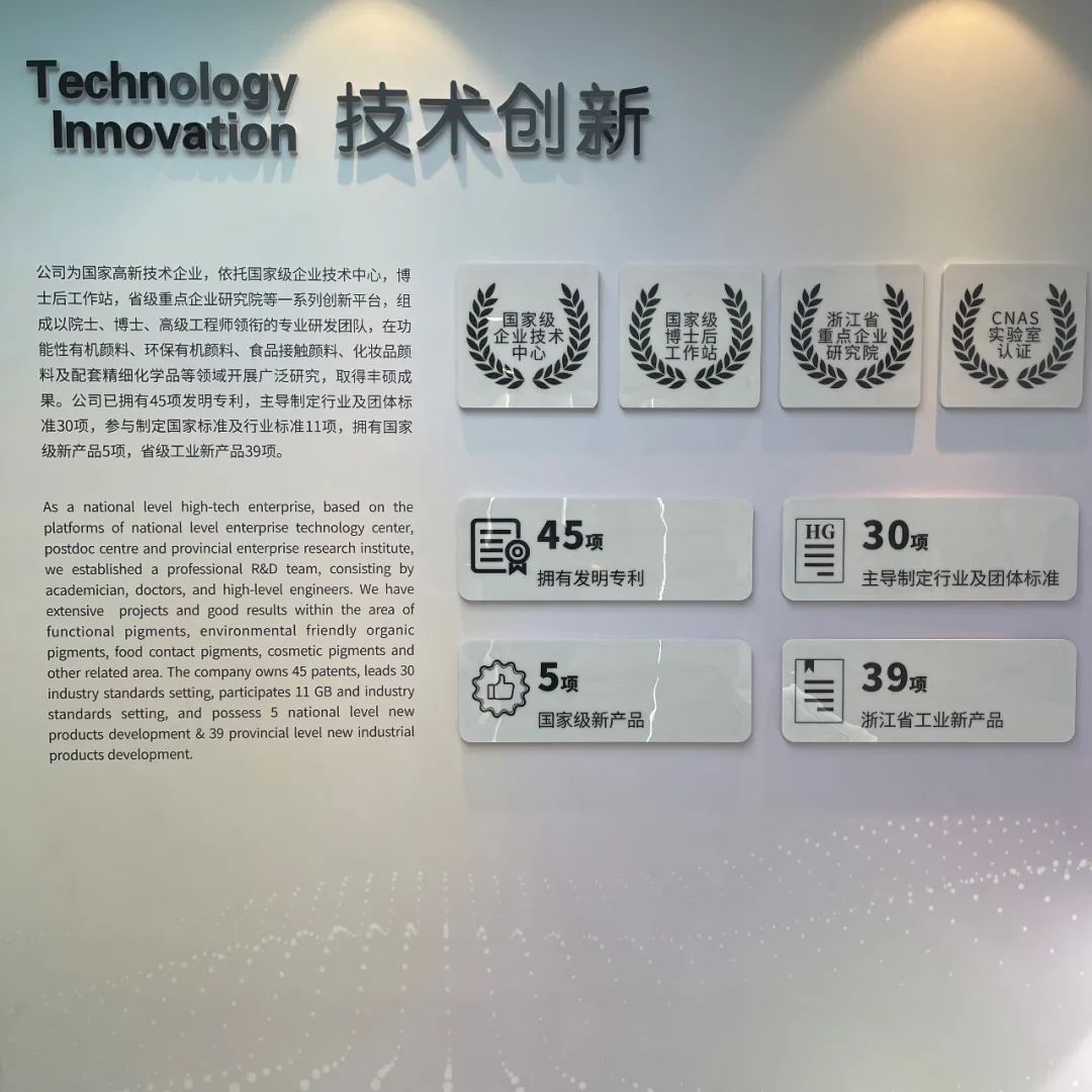 完美体育在线登录花为国家高新技术企业,依托国家级企业技术中心,博士后工作站,省级重点企业研究院等一系列创新平台,以王峰博士领衔,组成以院士、博士、高级工程师领衔的专业研发团队,在功能性有机颜料、环保有机颜料、食品接触颜料、化妆品颜料及配套精细化学品等领域开展广泛研究,取得丰硕成果。公司已拥有45项发明专利,主导制定行业及团体标准30项,参与制定国家标准及行业标准11项,拥有国家级新产品5项,省级工业新产品39项。