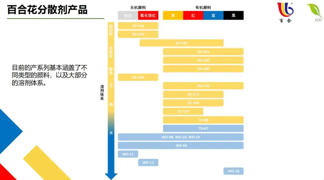 目前公司的分散剂产品主要分为SD溶剂型、WD水性和TD高极性体系,三大系列产品。三系列产品的型号超过20支,适用于炭黑、钛白粉、金属颜料、有机红黄等多种颜料的体系分散。